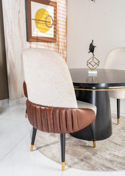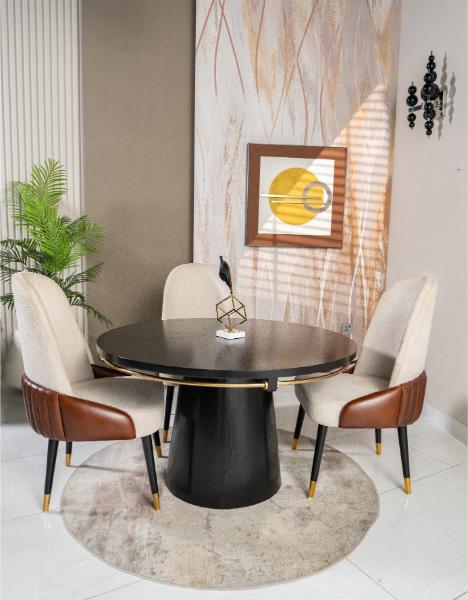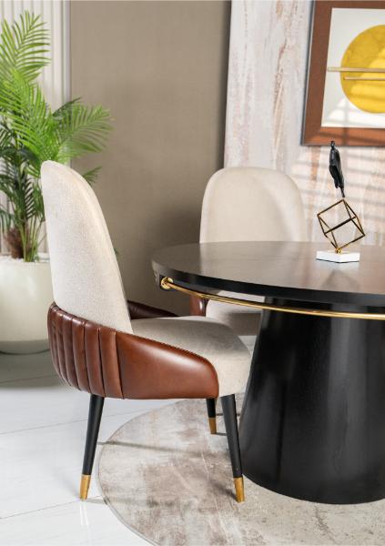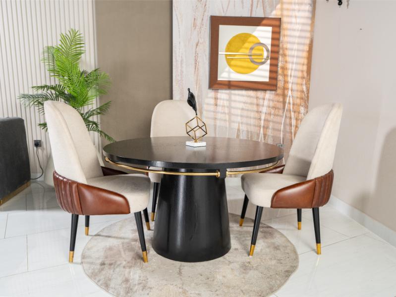 A modern blend of rich dark wood and warm beige tones, this round dining set creates an inviting space for intimate gatherings. Its smooth curves and earthy palette bring timeless elegance to contemporary dining.