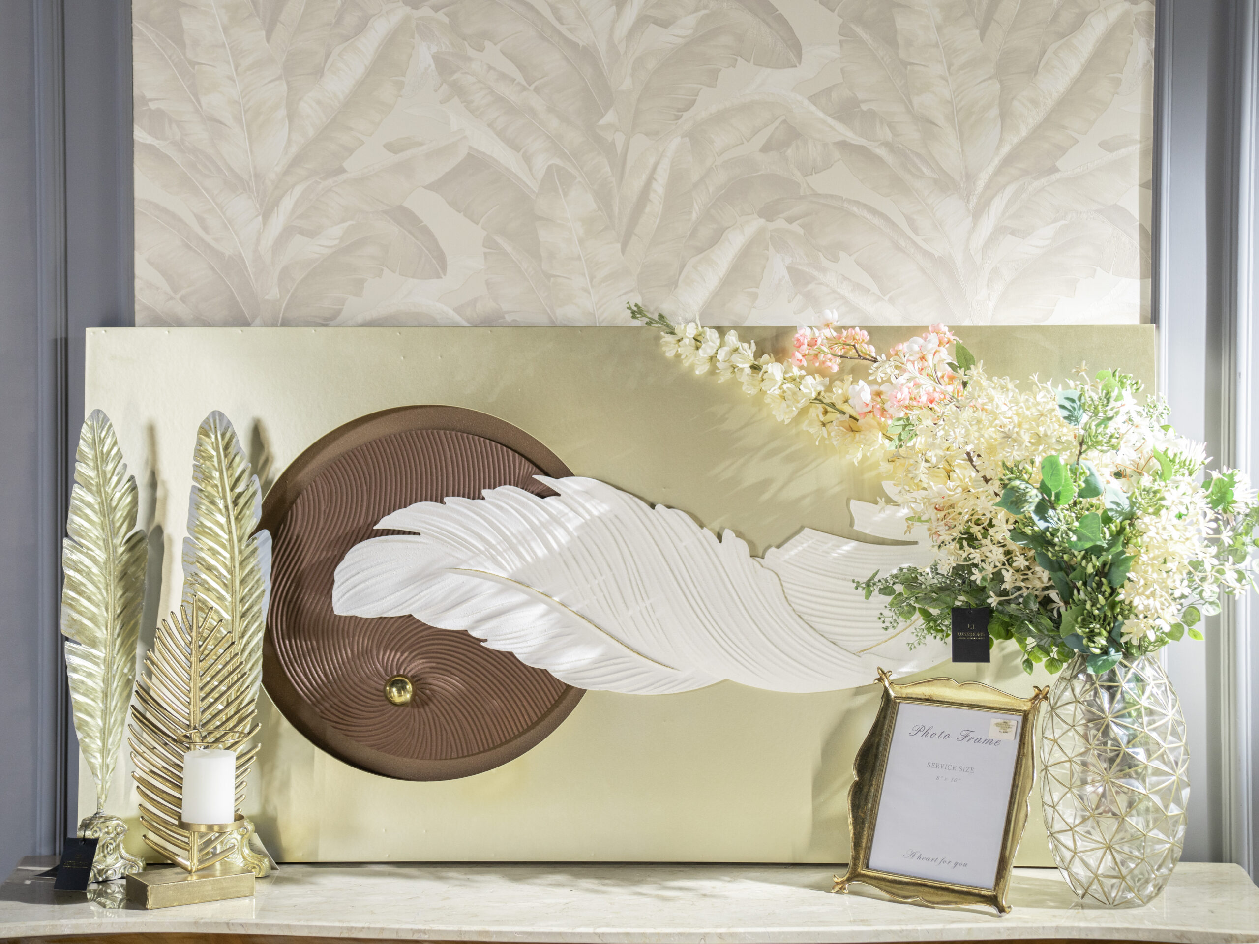 A luxurious candle holder designed with elegant, gold-painted feathers, offering a sophisticated touch. The holder cradles a white candle, creating a warm, inviting glow while enhancing the decor with its unique design.