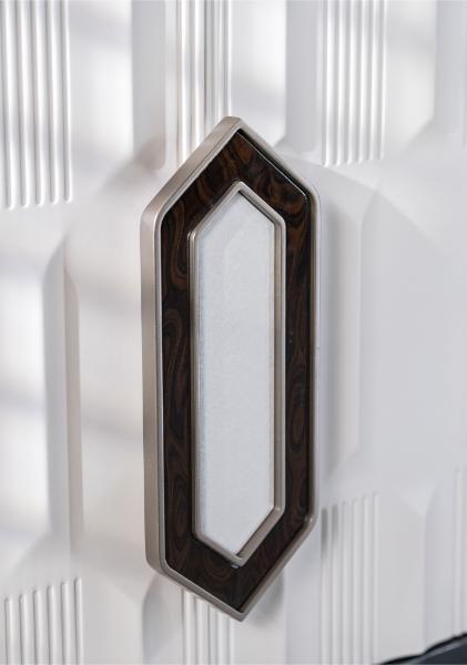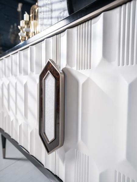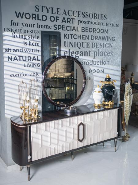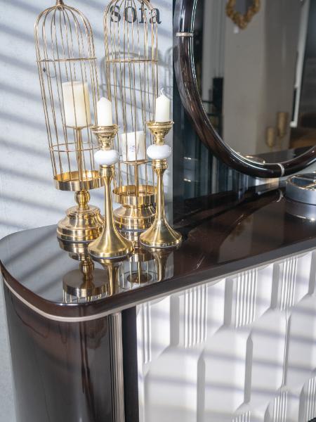 The IvoryLux Console is an elegant piece of furniture featuring a striking contrast of deep brown and soft ivory tones. The cabinet’s intricate geometric detailing on the front adds texture and a sense of luxury, while the polished wooden legs and sleek, curved design exude sophistication. The round mirror above further complements the design, reflecting light and enhancing the space’s overall aesthetic. Perfect for those who appreciate modern elegance with a touch of