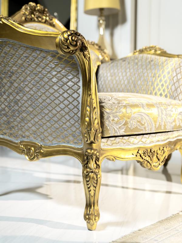Exquisitely crafted for a truly majestic living space, the Monarch Rococo Living Room Ensemble is a testament to timeless grandeur. This magnificent collection features a three-seater sofa, a two-seater sofa, and two matching armchairs, all hand-carved with intricate Rococo details and finished in a brilliant gold leaf.